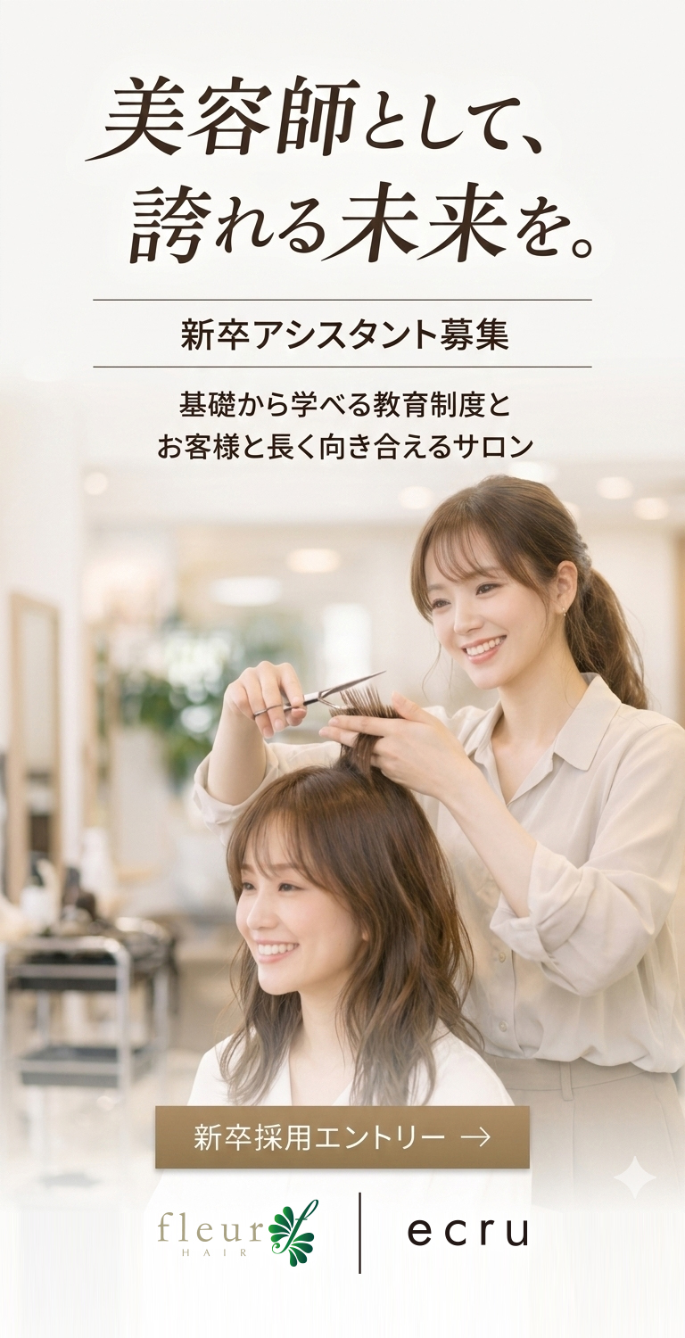 髪が傷んだら、頭皮が悪くなったら、なりたいヘアスタイルや質感には近づけなくなります。そのような状態では、お客様の本来の美しさを維持することはご自身では出来ません。ヘアデザインは本質的に、髪と頭皮の健康から紡ぎ出されるものです。髪と頭皮のいとなみを、本来もつ美しさを、受け継がれてきたフルールのプロフェッショナルな技術や智慧、新しい薬剤やあらゆる情報で、現在そしてさらに先の未来へつなげていくために。フルールから生涯うつくしくありたいお客様に向けて1年、3年、5年、10年。。。ご一緒に歳月をかさねながらいきいきと健やかで美しい髪と頭皮を、お客様と繋げてまいります。